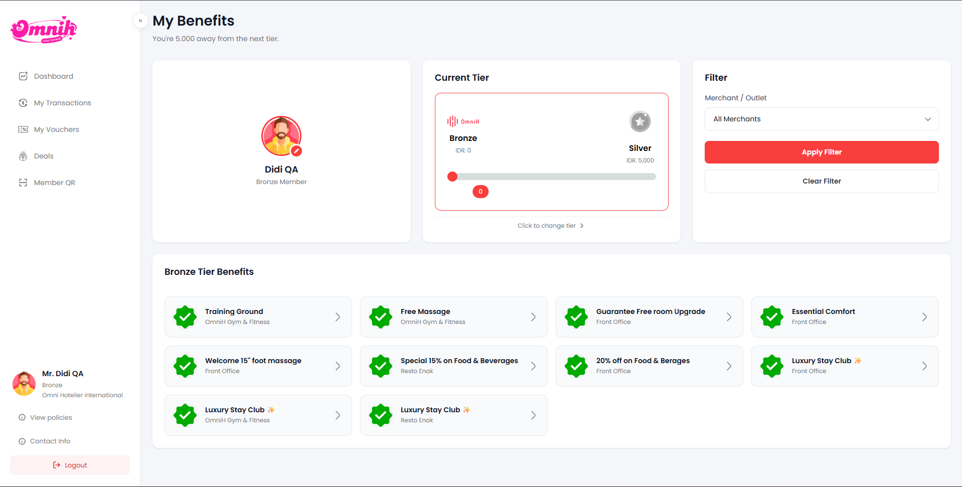 Setiap tier, seperti Silver, Gold, Platinum, Diamond, dan lain sebagainya sebagaimana tier yang diatur corporate menawarkan manfaat yang semakin eksklusif seiring dengan peningkatan level keanggotaan member. Contohnya, pada Silver Tier, member dapat menikmati diskon 10% untuk reservasi hotel dan penawaran sarapan gratis. Ketika mencapai Gold Tier, mereka mendapatkan akses ke pengalaman premium seperti Golden Stay dan bonus voucher diskon pada hari ulang tahun. Pada Diamond Tier, member memperoleh keuntungan eksklusif berupa undangan ke acara spesial seperti gala dinner atau konser, serta gratis satu malam menginap di suite pilihan. Konsep ini memungkinkan benefit ditampilkan secara dinamis dan fleksibel, menyesuaikan dengan kebijakan merchant yang terus diperbarui. Dengan memberikan insentif yang relevan dan berjenjang, sistem ini menciptakan pengalaman loyalitas yang menarik dan mendorong member untuk terus aktif dalam program keanggotaan.