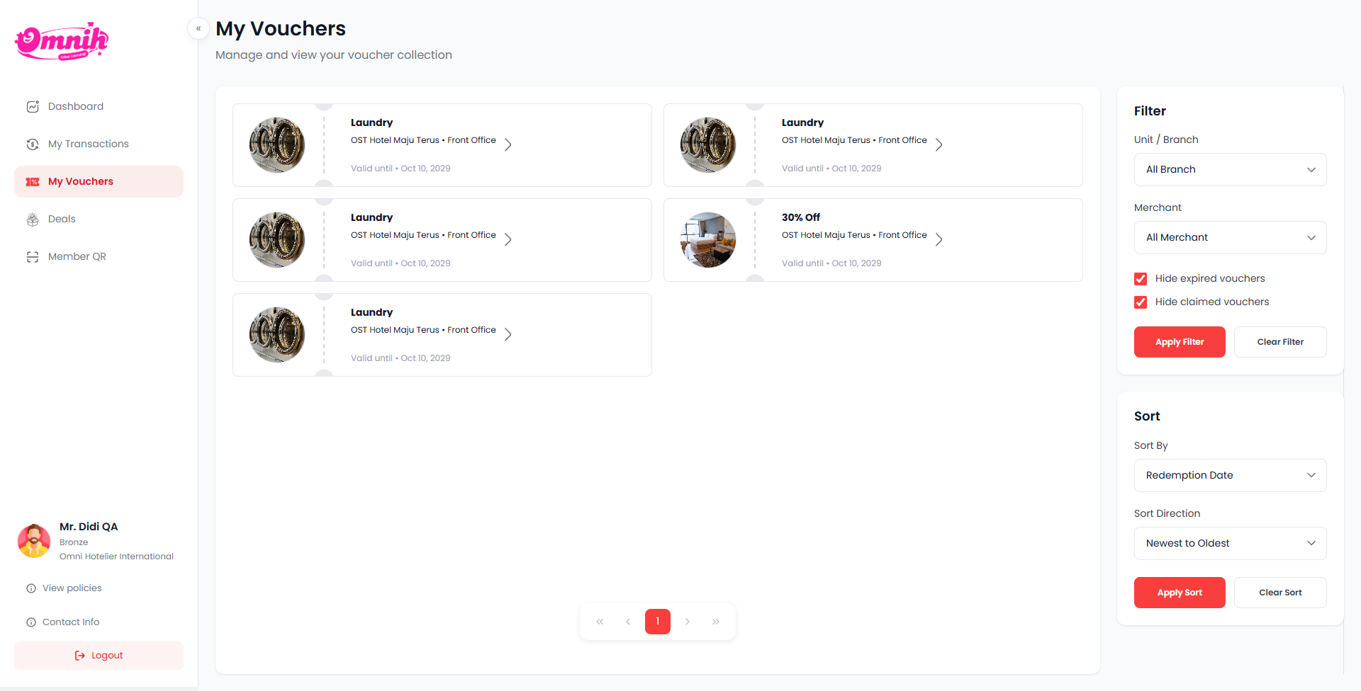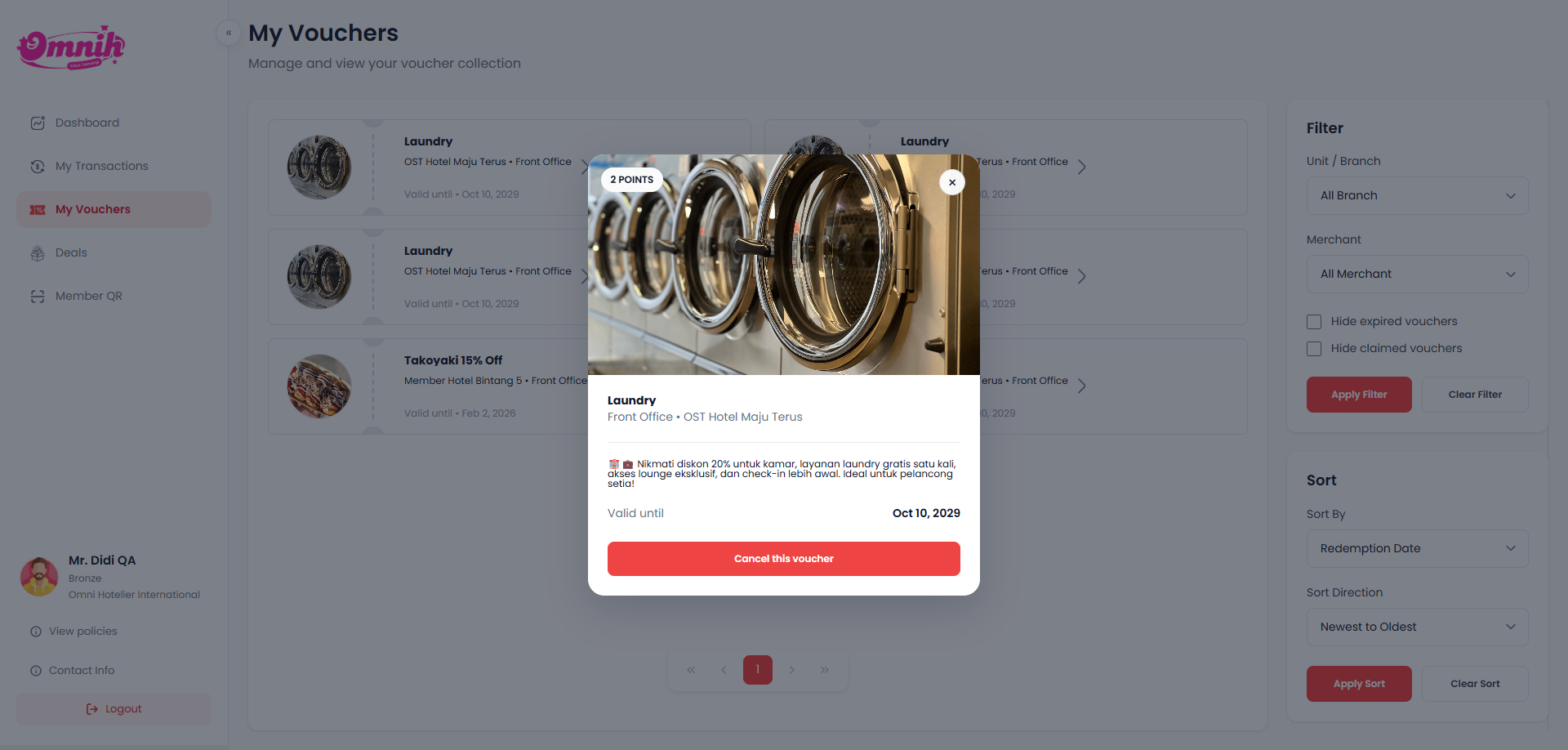Agar member dapat dengan cepat menemukan voucher yang relevan, halaman My Vouchers dilengkapi dengan fitur Filter dan Sortir.