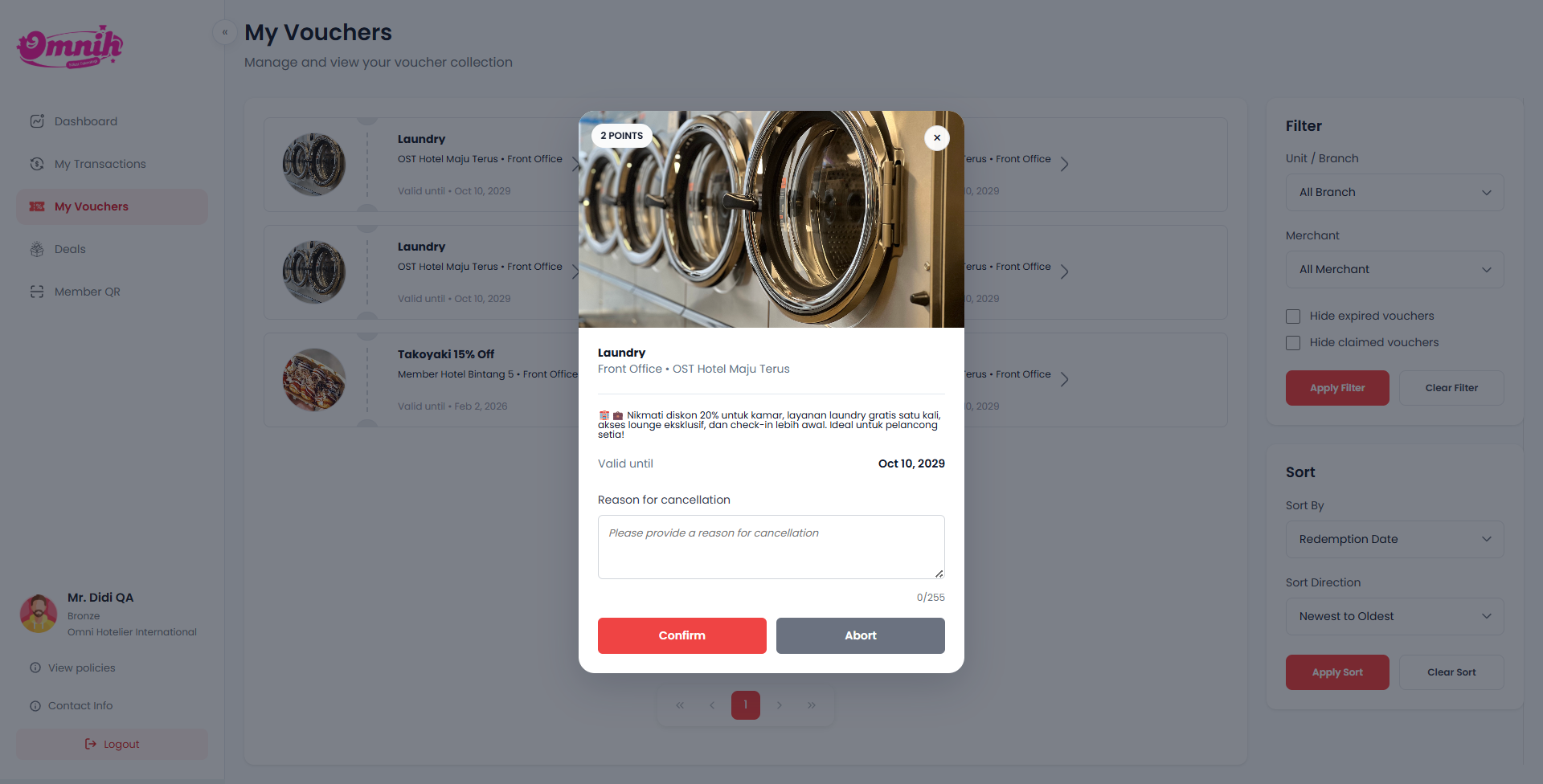 Ketika opsi Cancel dipilih, sistem akan menampilkan formulir yang berisi kolom untuk mengisi alasan pembatalan (Reason for Cancellation). Member kemudian dapat memilih tombol Cancel untuk melanjutkan proses pembatalan, atau tombol Abort jika mereka ingin membatalkan tindakan tanpa mengubah status voucher.