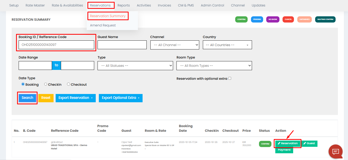 1. Masuk ke menu Reservations - Reservation Summary kemudian masukkan Booking ID dan klik Search. Jika sudah muncul reservasi yang ingin di amend silahkan klik Reservation.