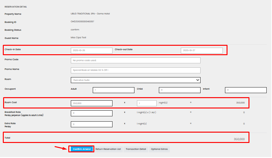 3. Silahkan lakukan amend sesuaikan dengan permintaan tamu untuk tanggal Check in atau Check out nya. Double check pada bagian Room Cost dan Total reservasi, apabila sudah sesuai silahkan klik Confirm Amend.