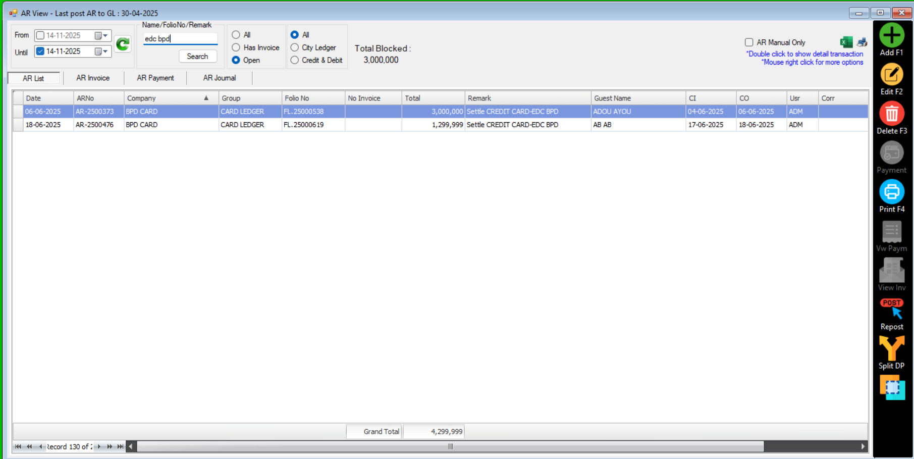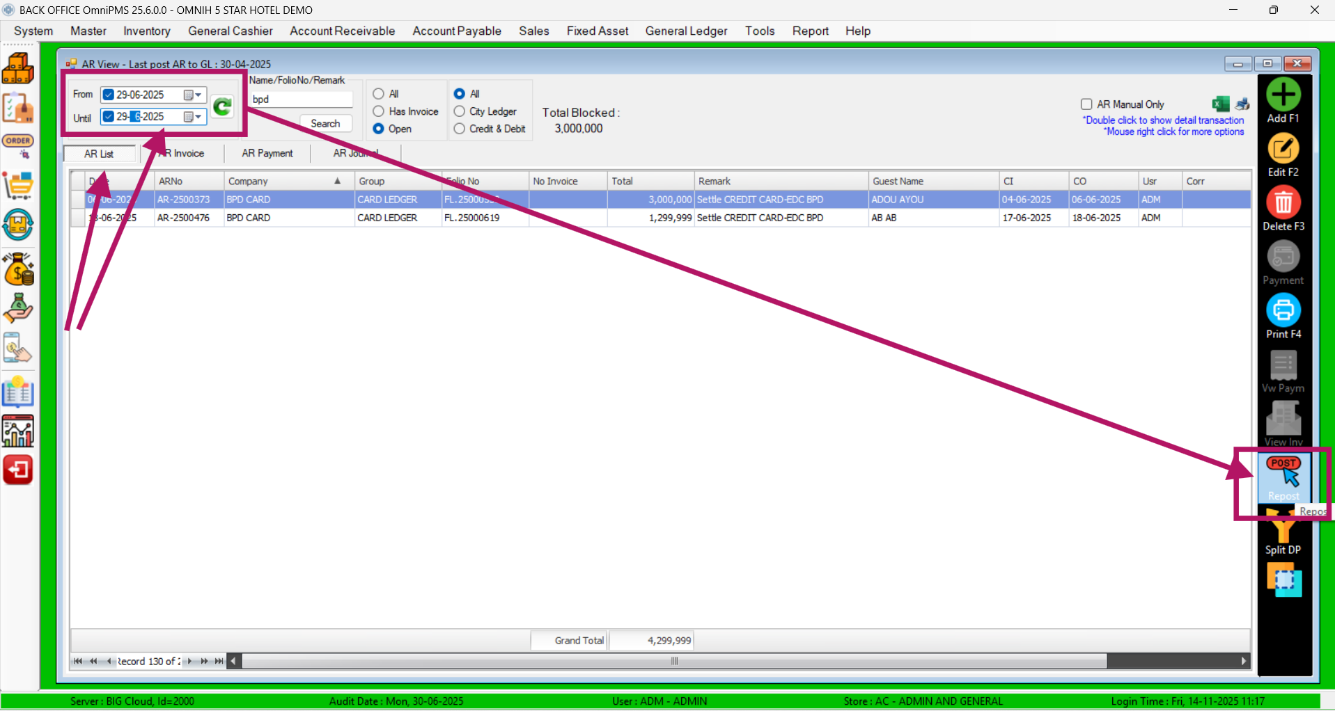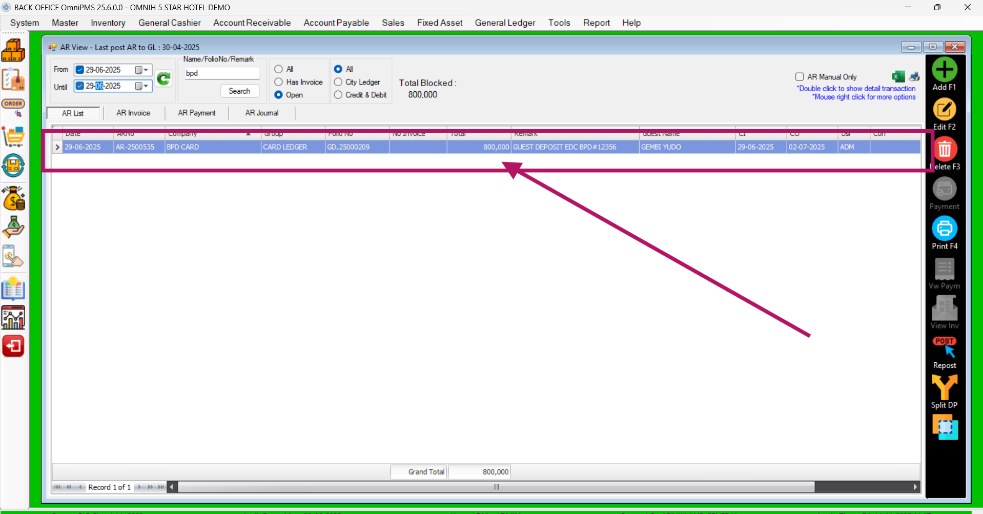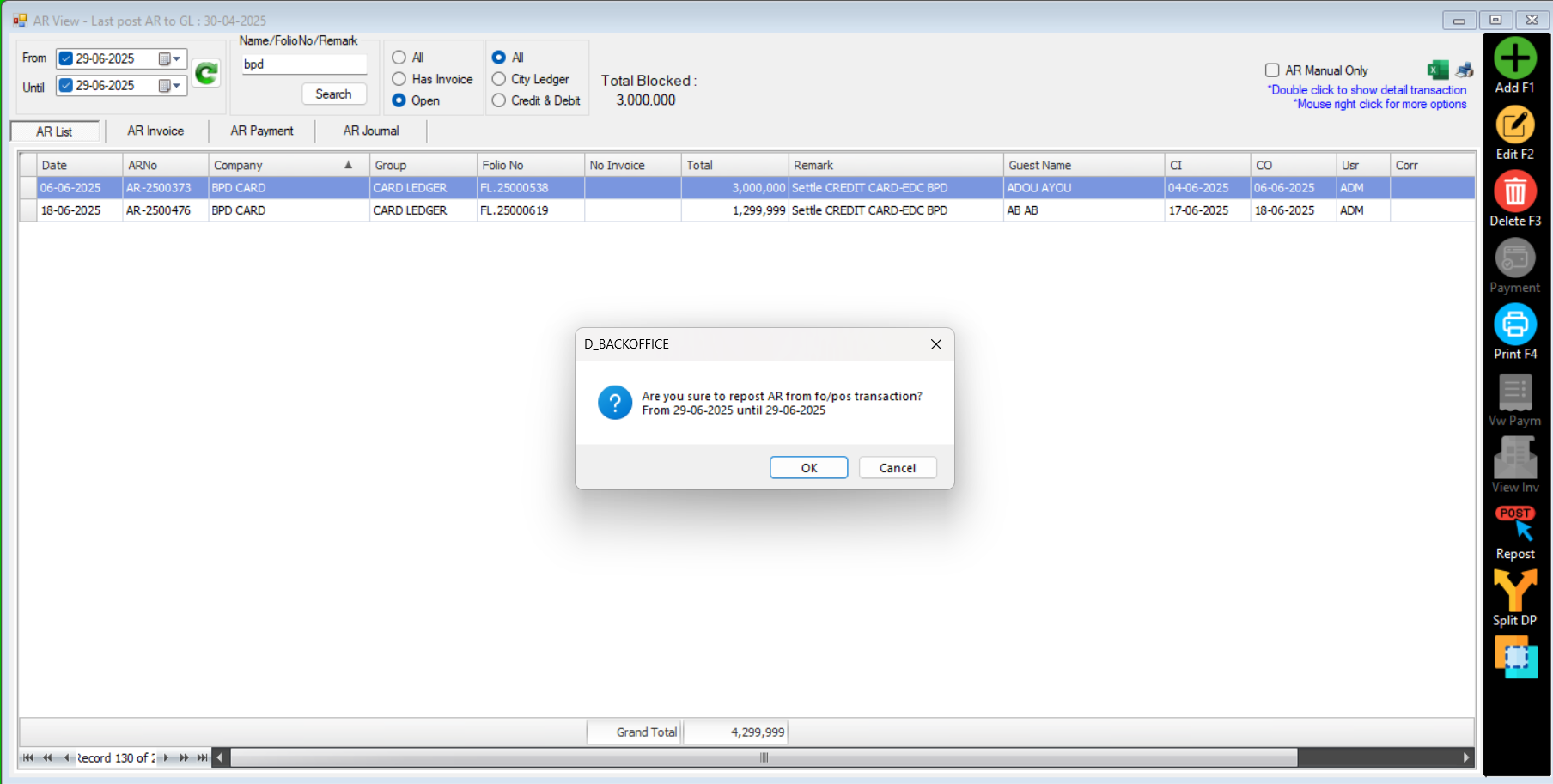 Apabila ditemukan kendala dimana di sisi sistem FOS maupun POS dilakukan penginputan mundur (Post Date) yang berkaitan dengan Pembayaran pastinya hasil akhirnya nilai tersebut akan muncul di AR List yang nantinya akan dilakukan reconsil terhadap pembayaran tersebut, akan tetapi ada kalanya jika dilakukan penginputan mundur nilai tersebut tidak muncul di AR List, sebagai contoh kasus ada di bawah ini: