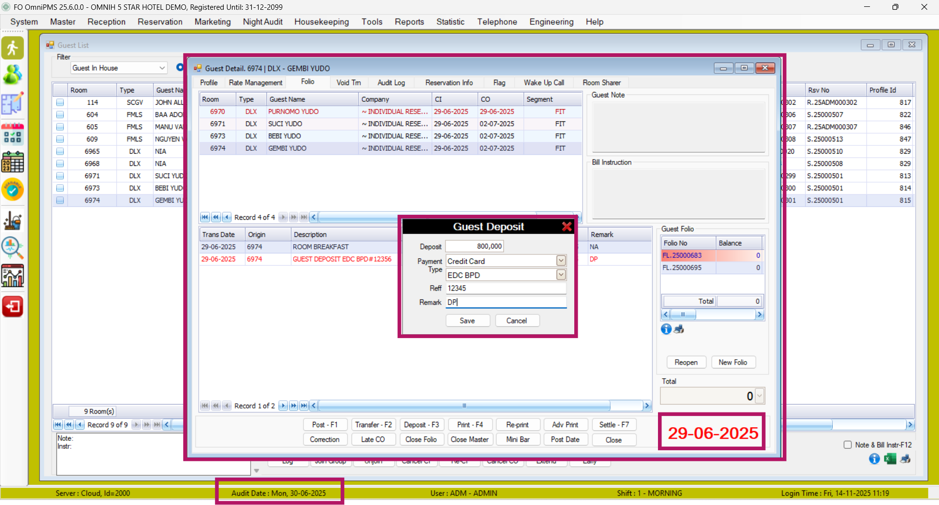 Pada hari ini tanggal 30 Juni 2025 ada penginputan pembayaran dengan cara di Post Date ke tanggal 29 Juni 2025 dengan nominal Rp. 800,000, dengan method payment credit card EDC BPD