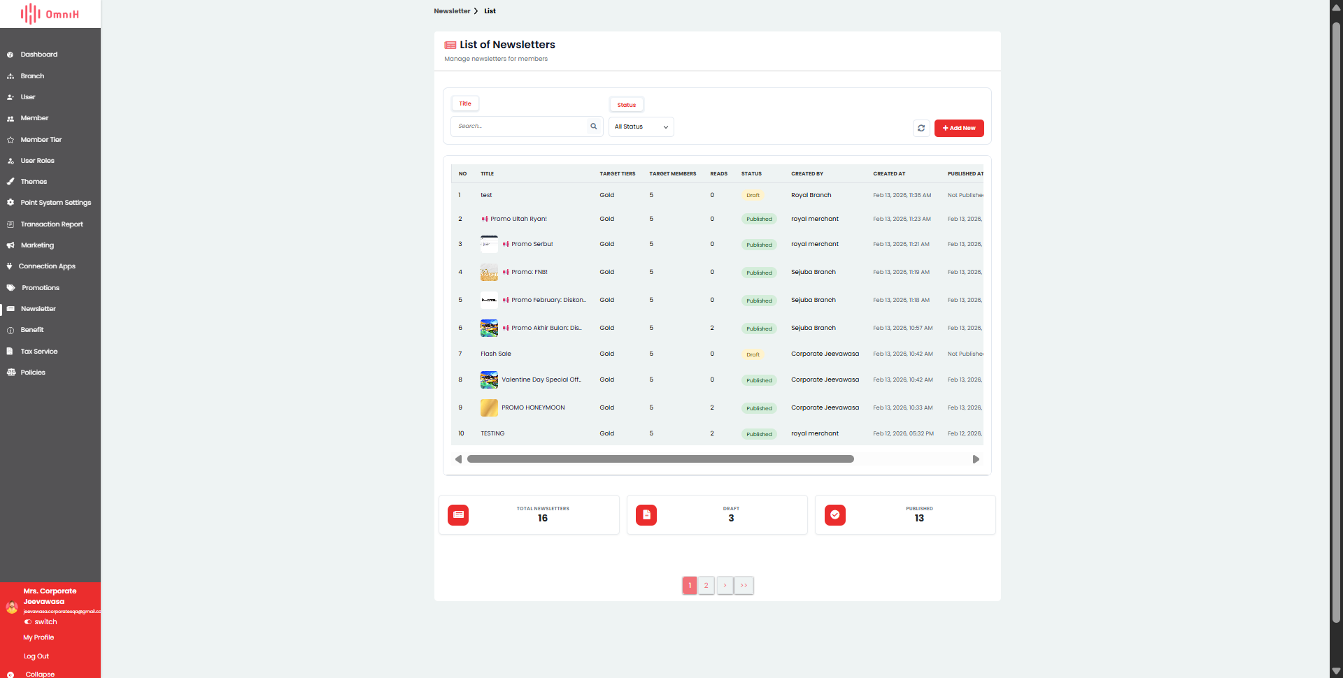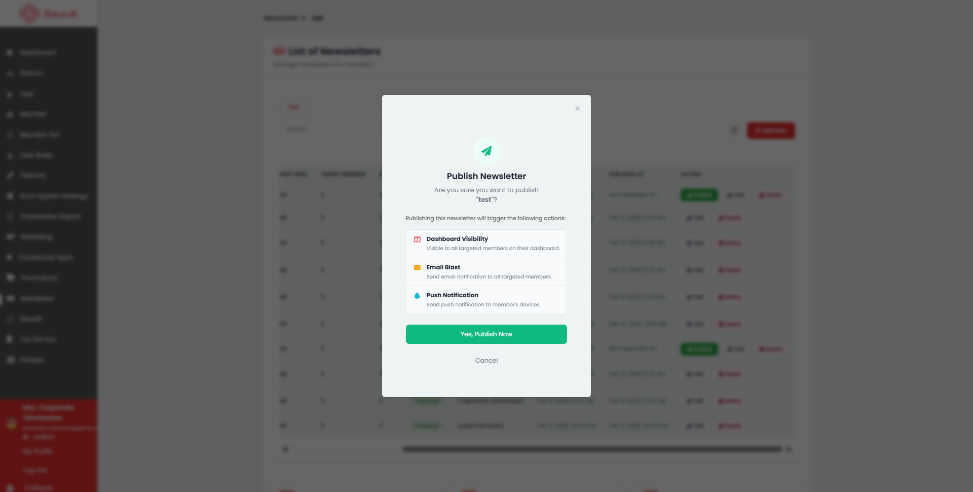 Newsletter adalah fitur baru dari membership yang dimana corporate dapat mengirimkan notifikasi email bila adanya promo atau voucher terbaru kepada para pengguna member. Untuk mengakses fitur ini pastikan corporate telah mendapatkan akses untuk fitur newsletter ini.