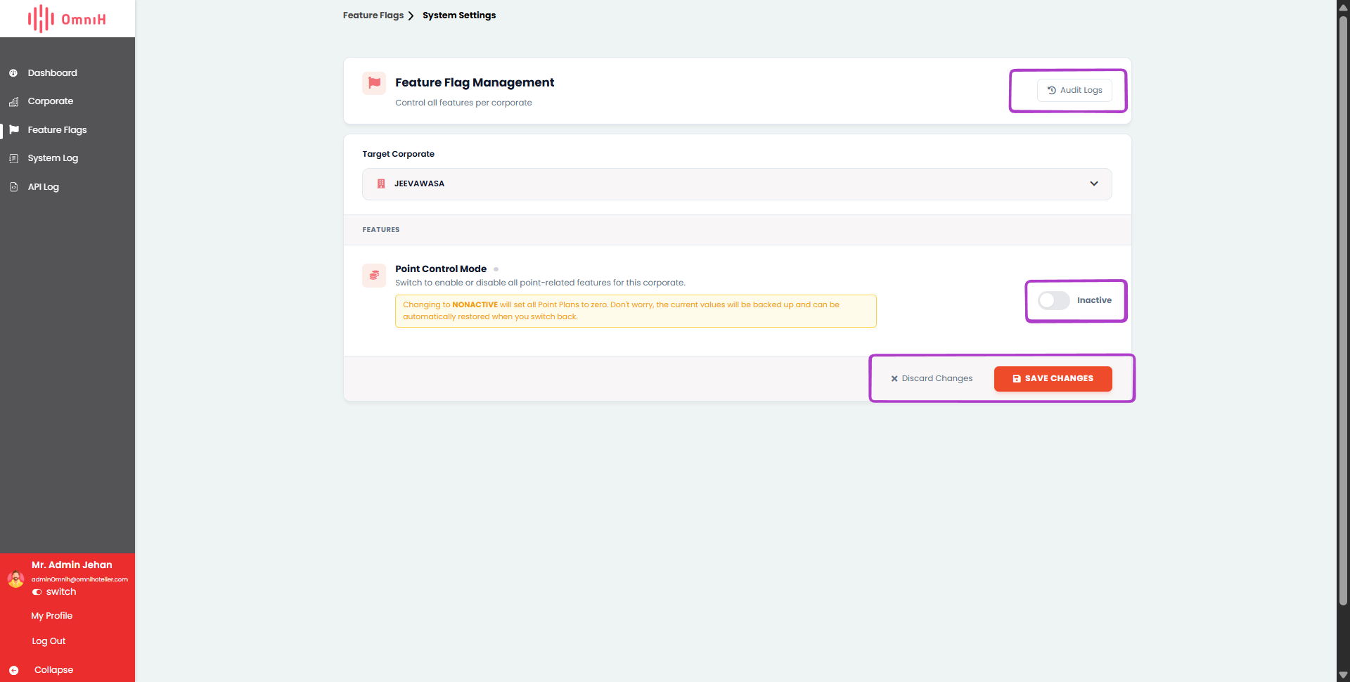 Point Control Mode merupakan fitur kontrol utama untuk mengaktifkan atau menonaktifkan seluruh fitur yang berkaitan dengan sistem point pada corporate yang dipilih. Ketika fitur ini diaktifkan, corporate dapat menggunakan seluruh mekanisme point yang tersedia di sistem, sedangkan jika dinonaktifkan, seluruh fitur point pada corporate tersebut tidak dapat digunakan.