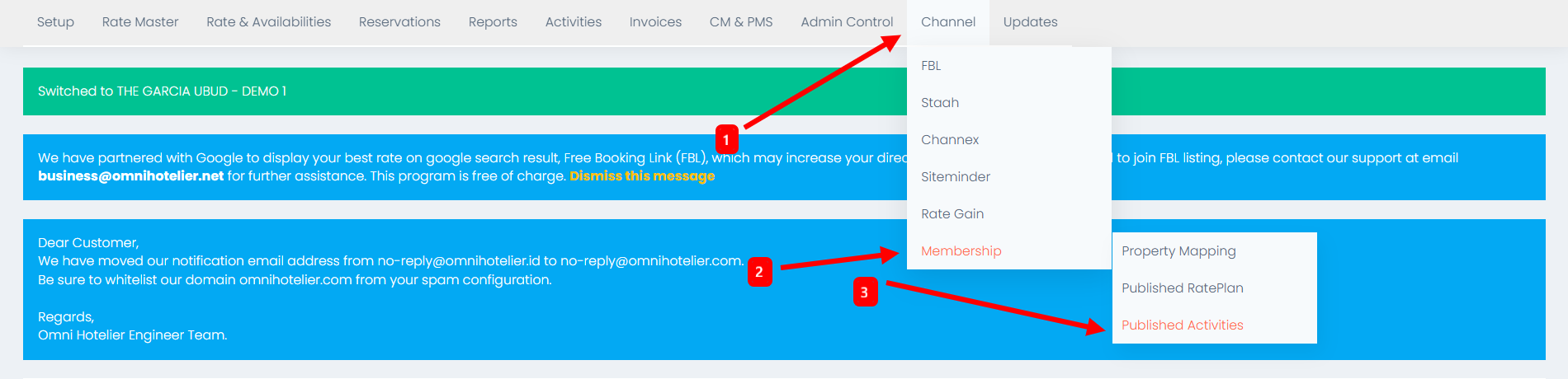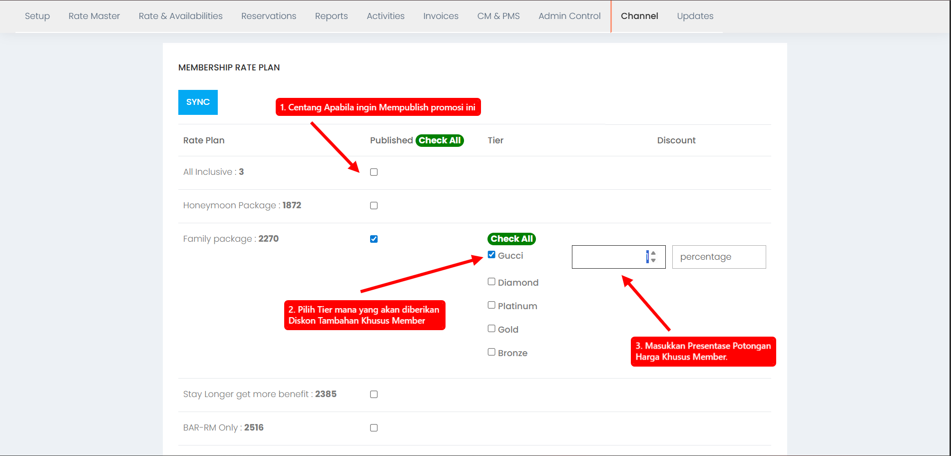 Channel → Membership → Published RatePlan ( Untuk Akomodasi ) /Published Activities (Untuk Aktivitas) -> Klik Sync.