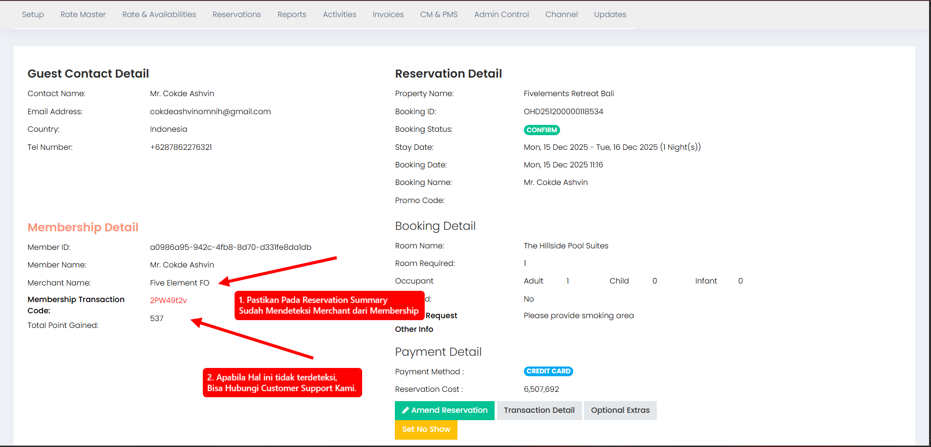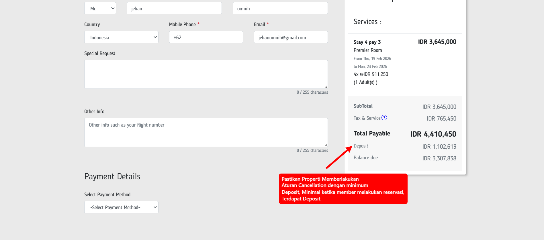 Untuk transaksi dari Booking Engine (terintegrasi), poin member hanya akan diproses jika reservasi memiliki deposit.