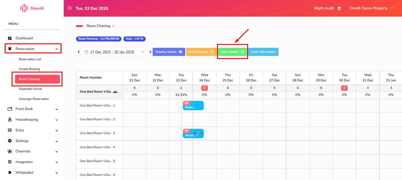 1. Masuk ke menu Reservation - Room Charting - Bulk Update.