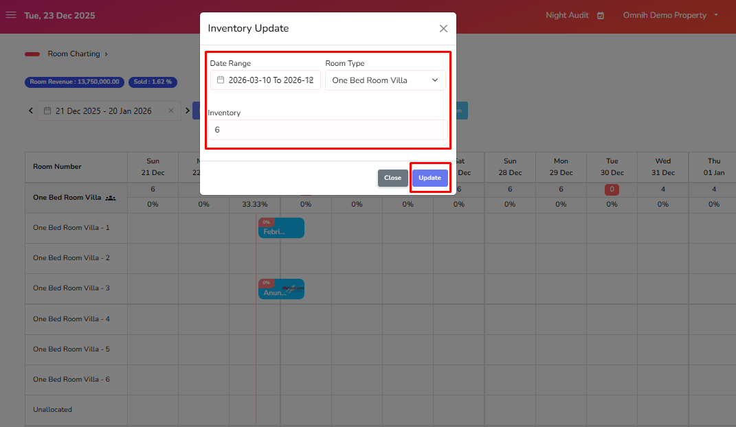 2. Kemudian sesuaikan kembali untuk Date Range, Room Type dan Inventory, apabila sudah sesuai klik Update.