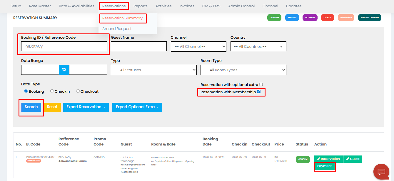 1. Masuk ke BE pilih menu Reservations - Reservation Summary - Masukkan Booking ID atau bisa disesuikan berdasarkan kolom yang tersedia - tick pada bagian Reservation with Membership - klik Search - klik Payment pada reservasi yang ingin di Sync Log.