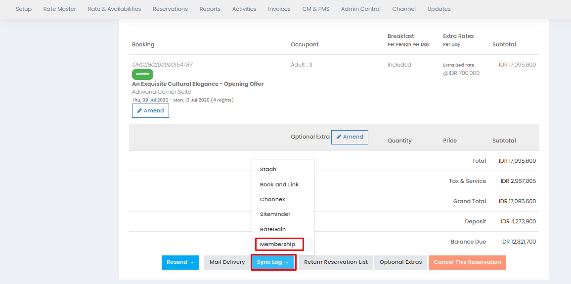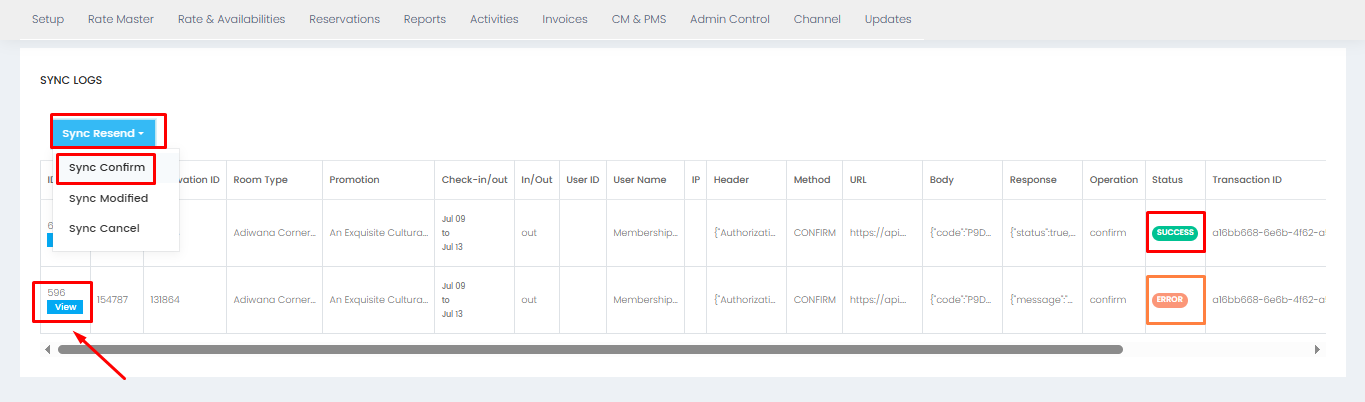 3. Kemudian klik Sync Resend - Sync Confirm. Apabila statusnya "Success", artinya reservasi sudah masuk di dashboard Membership namun untuk memastikan dari sisi property perlu double check kembali pada dashboard Membership nya. Namun apabila statusnya "Error", bisa dibantu klik "View" kemudian scroll ke bawah untuk melihat "Response" dari keterangan "Error" tersebut.